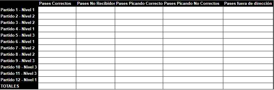 Por ejemplo, sin con un equipo de 8va. división estamos entrenando el push y la recepción, lo más lógico sería medir la cantidad de pases que son conectados, la cantidad de pérdidas por mala recepción o por mala dirección del pase y la cantidad de veces que la bocha sale picando. Para que estos datos tengan algún valor, debo por lo menos fijar un periodo de tiempo o una cantidad de partidos donde quiera hacer esas mediciones, en este caso voy a usar 12 partidos.